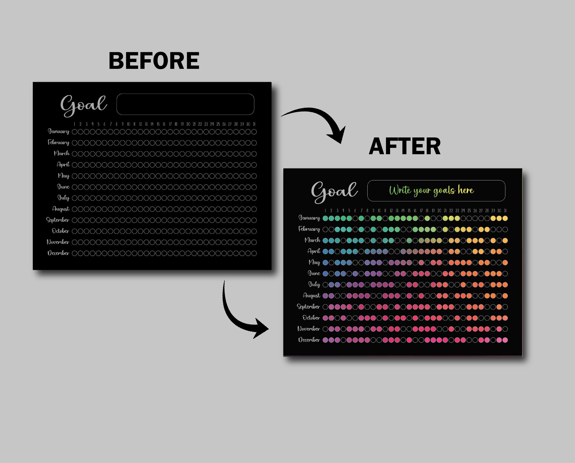Stay motivated all year long with this interactive 365 Day Goal Tracker! This 11x14 innovative wall poster features a scratch-off surface that reveals vibrant colors underneath, making each accomplished goal a visually rewarding experience. As you reach your goals, simply scratch off the day to reveal your progress. Perfect for fitness challenges, daily habits, personal growth, or any year-long project you want to achieve.