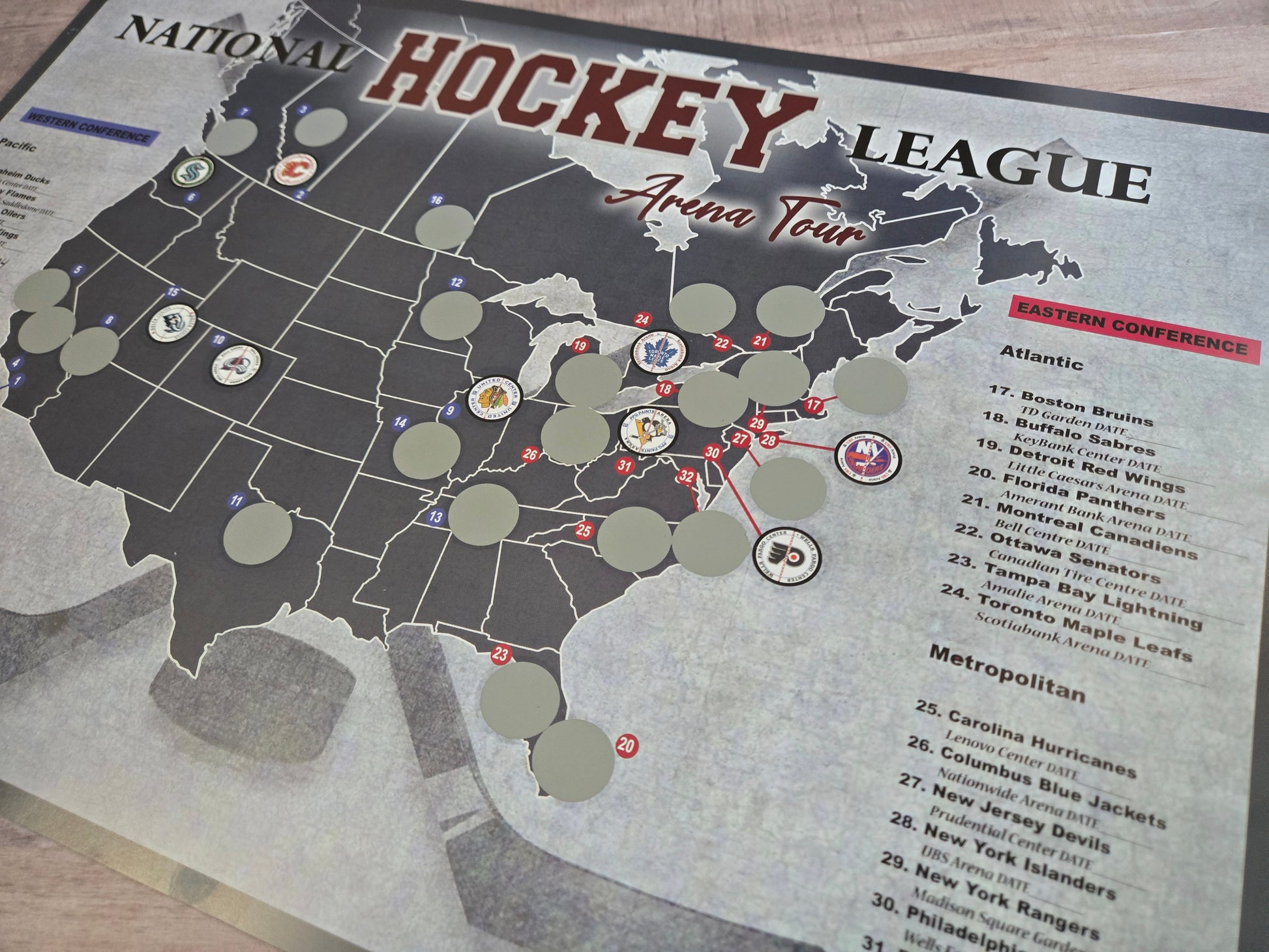 Track your hockey adventures with the Pro Hockey Arena Scratch Off Map. This high-quality poster is a must-have for any hockey fan, showcasing all NHL Hockey arena locations for you to scratch off as you visit. Included is Salt Lake City's newest Utah Mammoth!
