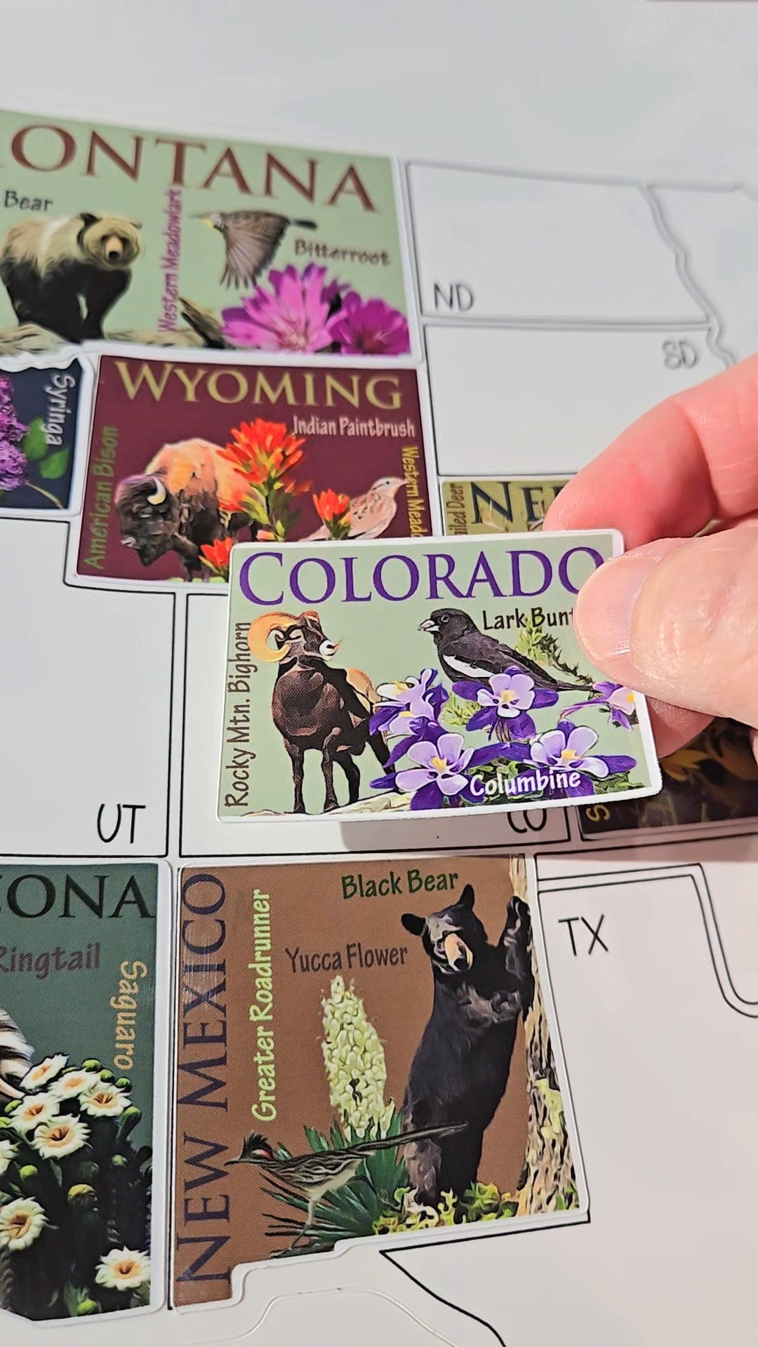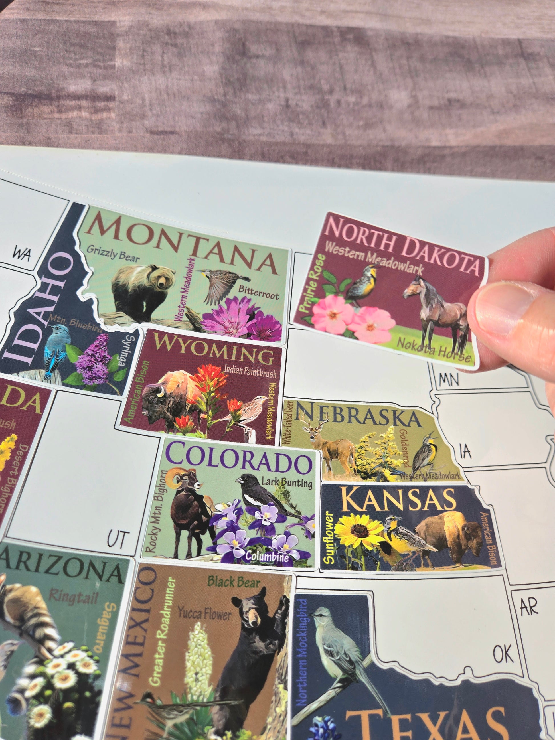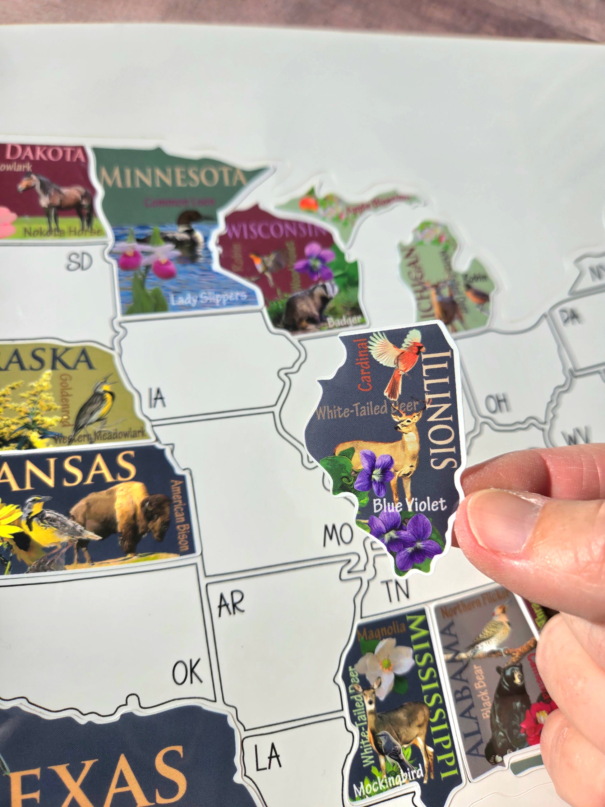 Track your adventures with this 17x11 inch vinyl sticker travel map! Each state features illustrated state symbols- including its official bird, flower, and mammal (when applicable), making it both a fun and educational display piece.